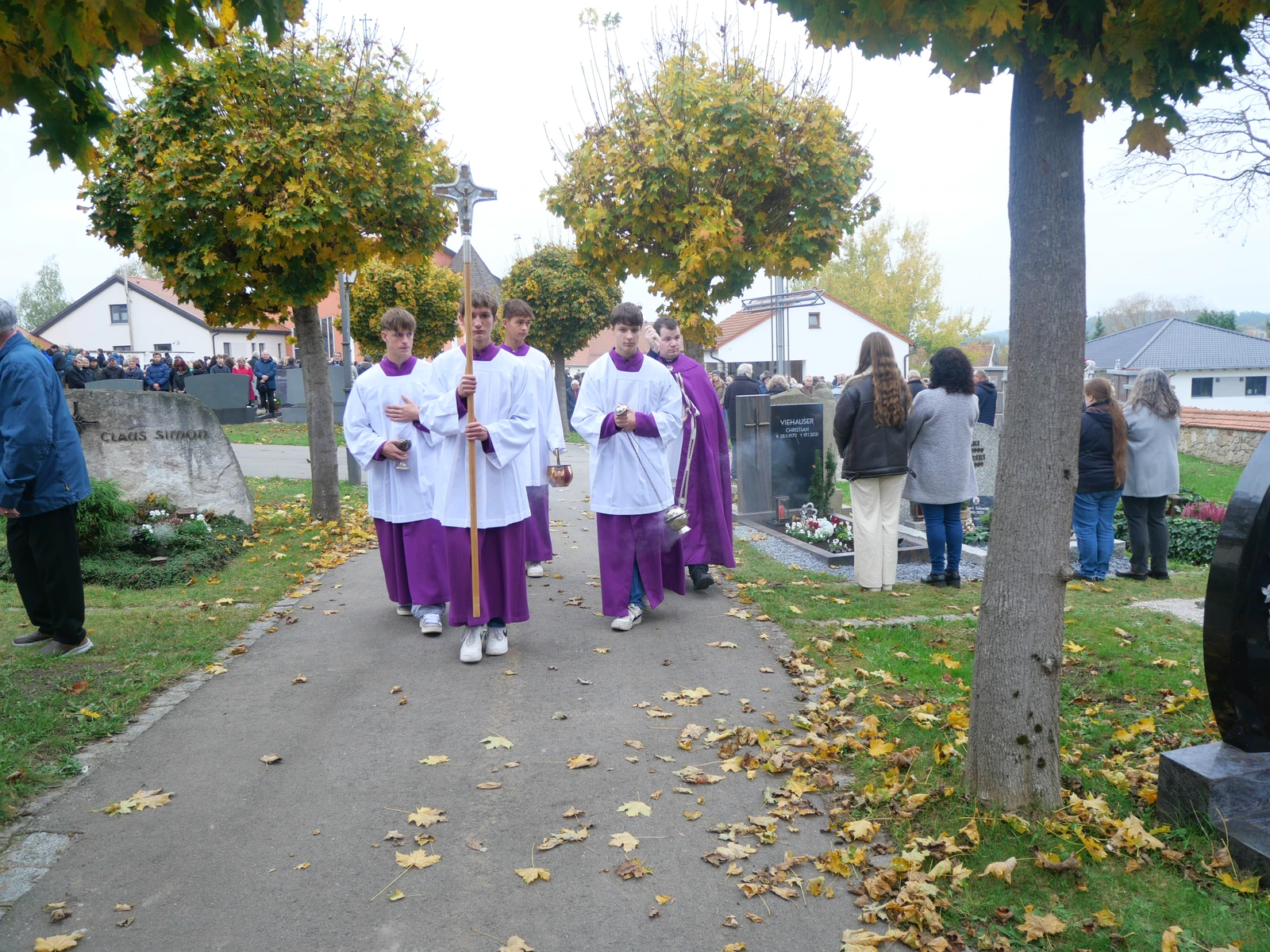 Der Nachmittag war für eine Andacht in der Kirche und anschließenden Besuch der Gräber mit ihren Angehörigen vorbereitet. Daher fanden sich viele Gläubige um 14 Uhr in der Pfarrkirche St. Leonhard ein, um unter anderem der in diesem Jahr in der Pfarrgemeinde verstorbenen Personen zu gedenken. Pfarrer Florian Frohnhöfer rief die Namen der heuer Verstorbenen nochmals in Erinnerung und für jede/n wurde am Altar von den Mesnerinnen ein Licht angezündet.