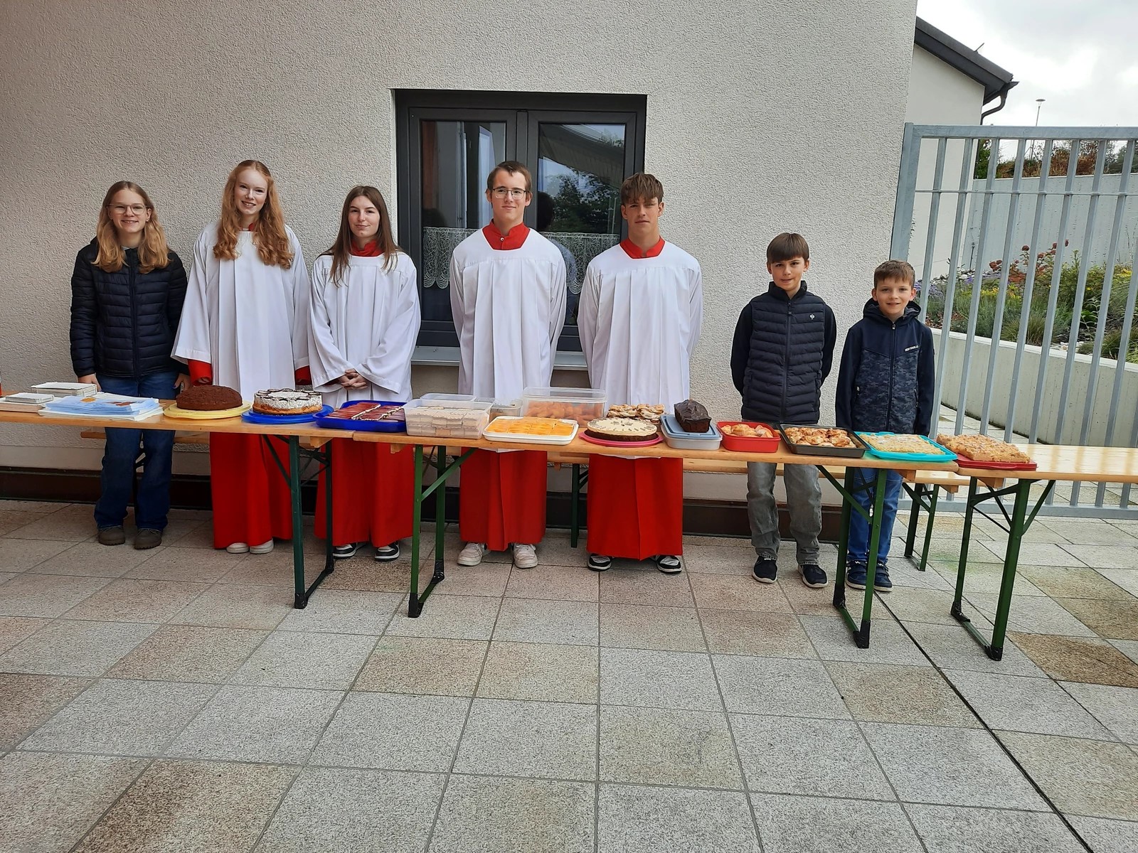 Nach dem Schlusslied gab es einen Stehempfang vor der Kirche, bei der die Gottesdienst-Besucher Gelegenheit hatten, den neuen Kaplan mit seinem freundlichen Wesen näher kennenzulernen. Bereits vor der Messe hatten die Ministranten ein langes Kuchenbüfett aufgebaut, das die Gäste zu schätzen wussten.