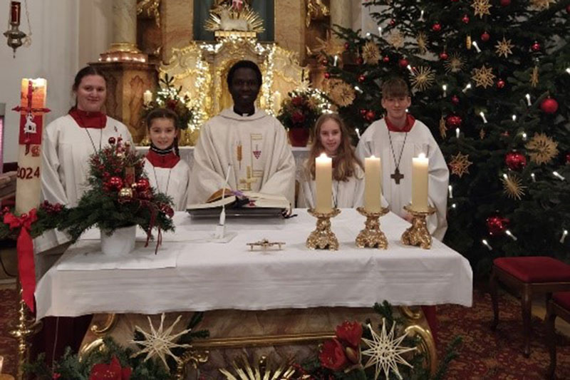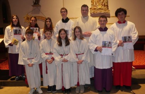 Zum Schluss verabschiedete der Geistliche acht Mädchen und Burschen, die fünf bis zehn Jahre zuverlässig und ehrfürchtig bei den Gottesdiensten ihren Dienst machten und sich in vielerlei kirchlichen Aktivitäten einsetzten. Pfarrer Frohnhöfer zollte ihnen Respekt und Anerkennung für ihren Dienst, bedankte sich per Handschlag und übergab den „Ausscheider und -innen“ eine Dankes-Urkunde und ein kleines Rauchfass als Geschenk. Großer Applaus erfüllte die Kirche nach Begrüßung und Verabschiedung.