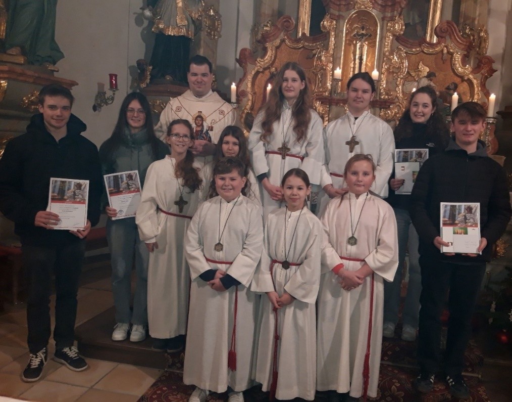 An Silvester wurden insgesamt neun neue Ministranten aufgenommen und bekamen eine Plakette. Zehn Ministranten wurden im Gottesdienst verabschiedet und bekamen zum Dank eine Urkunde.